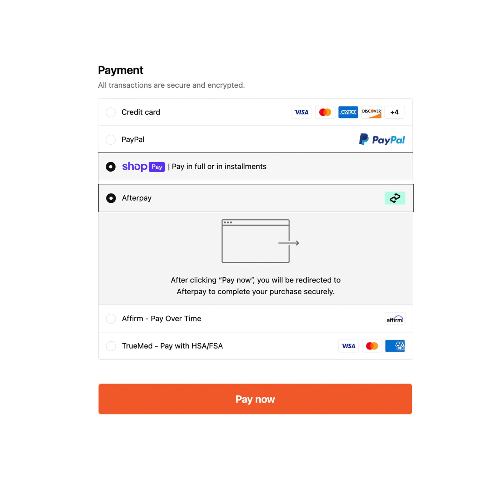 If you choose Afterpay, log in or create an account to finalize your order.If you choose ShopPay, make your first payment (if applicable) and let the rest be billed automatically.